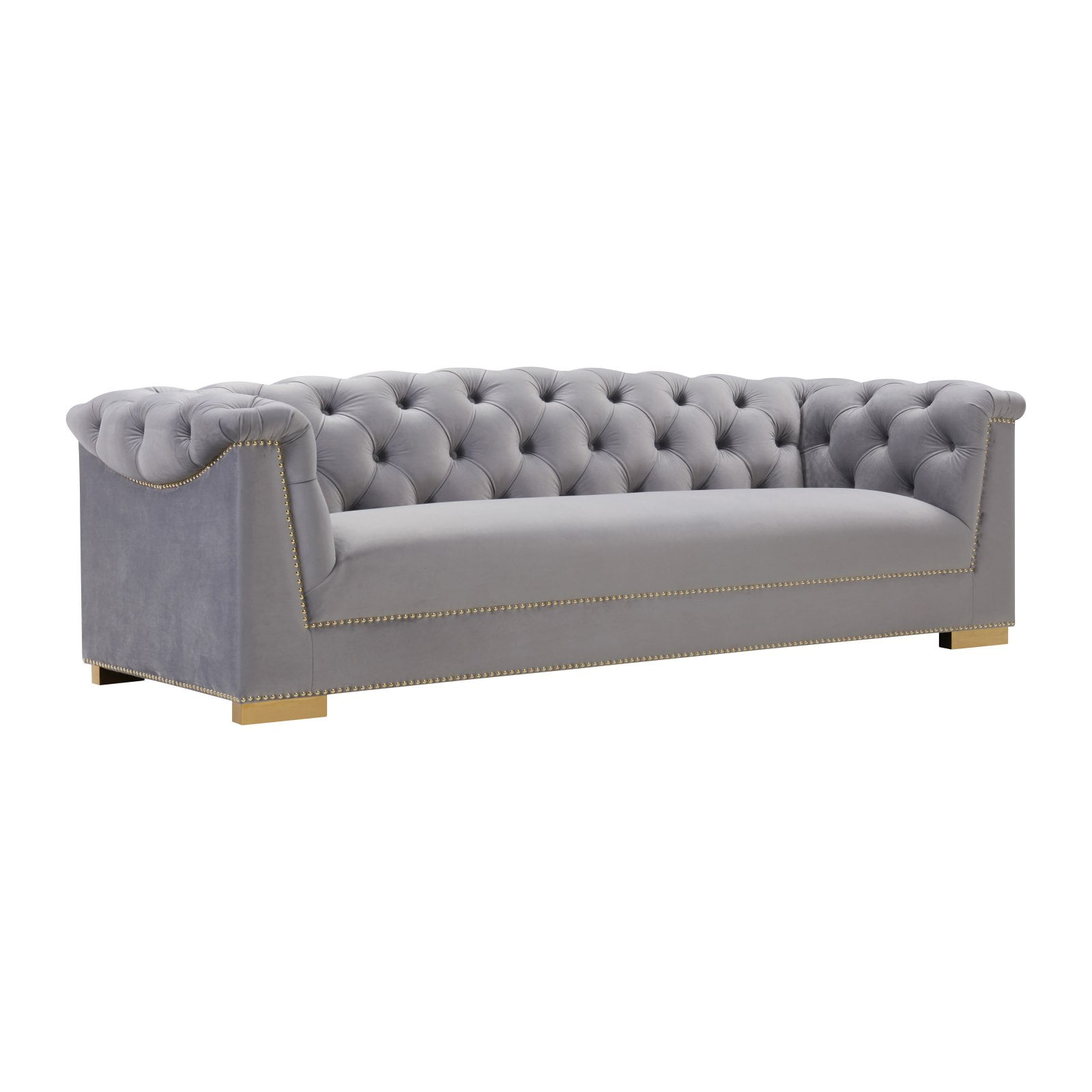 French country style gets a hint of a glamorous flair in this sofa. With its luscious velvet upholstery unique tufted design on its rolled arms and hand applied gold nailhead trim it will be the focal point of your living space. Its built with a solid and engineered wood frame and features rolled tuxedo arms for a chesterfield-inspired silhouette.